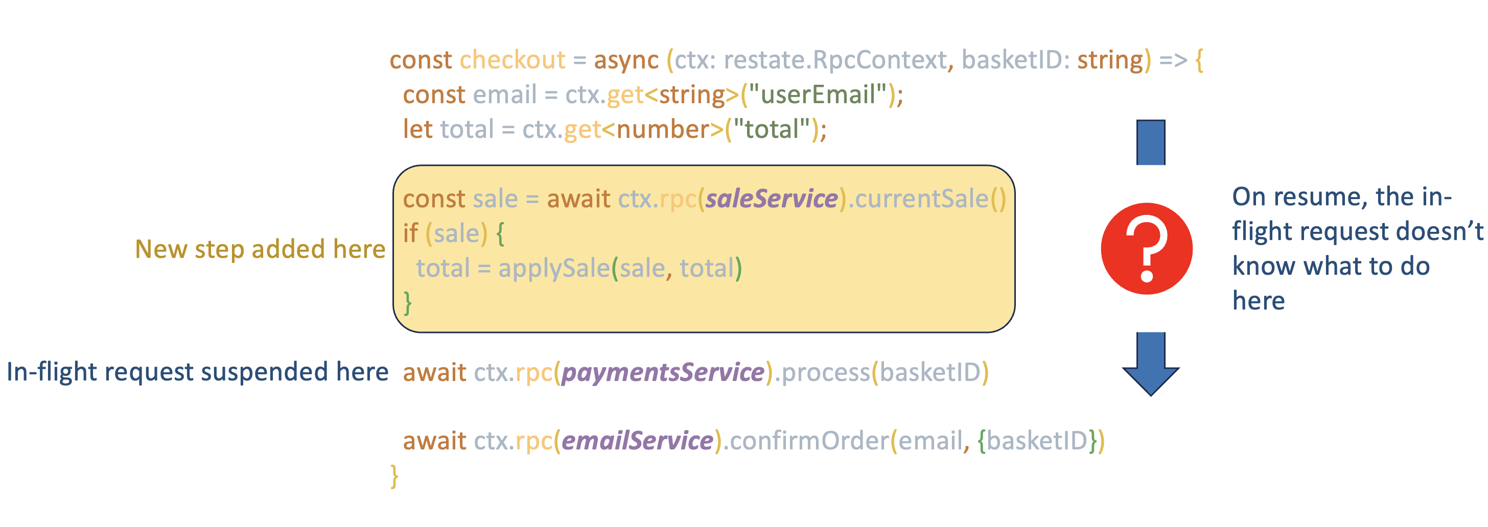 Without durable execution, updating code is typically not such a big problem. Assuming some form of retries happen, a request might start on an old version of code, get evicted partway through, and then retry on the updated version of the code. In practice, this is not a problem if both handlers are idempotent (as they must be anyway for retries to be viable), and if they accept the same input parameters and have roughly compatible behaviour. You might end up with some aspects of the business logic of the old version, and some aspects of the new version, but most of the time you wouldn’t be too concerned about this.