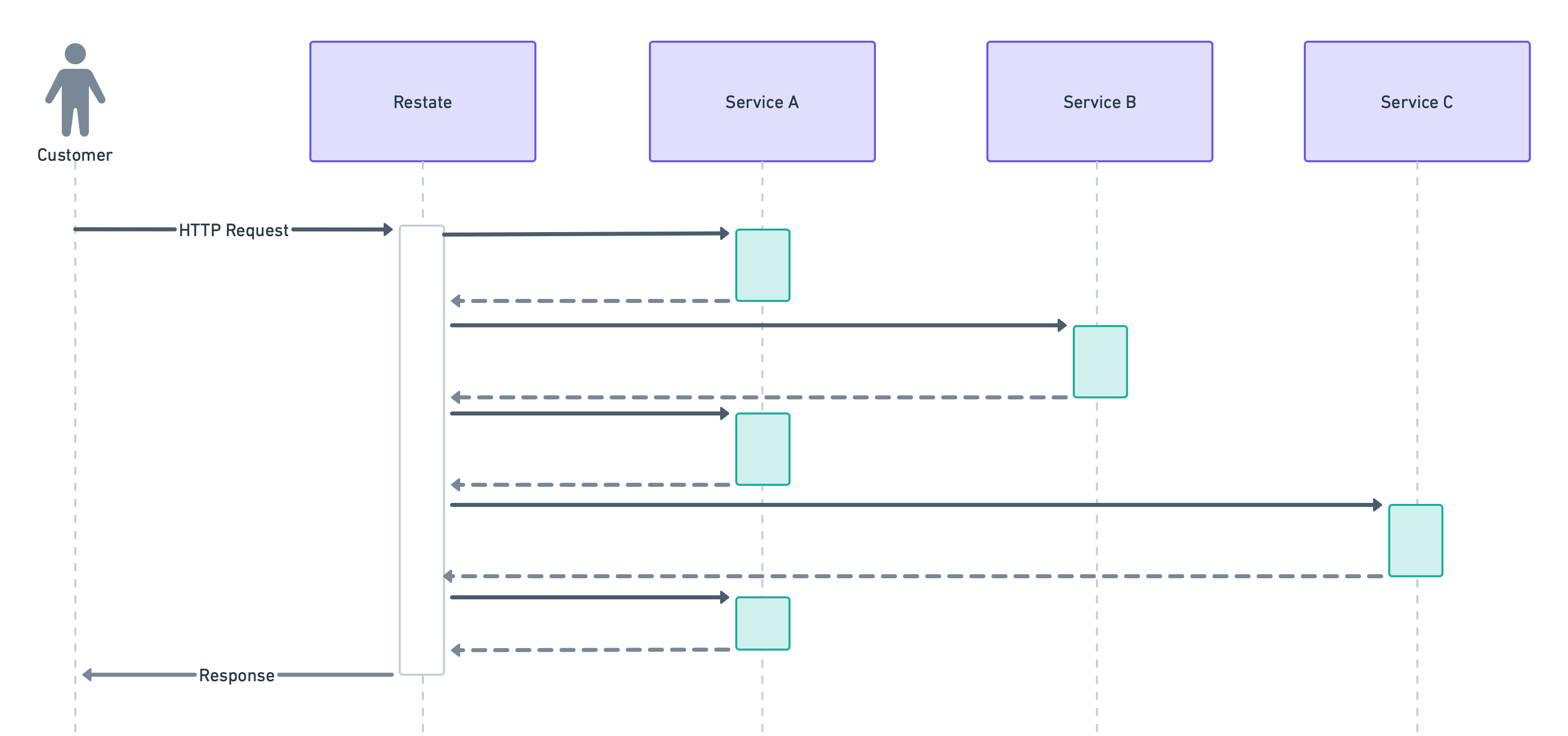 ctx.sideEffect(). This ensures that those steps are executed once, and their effects are recorded in the journal, just as we would a Restate RPC. We’ve used the utilityctx.rand.uuidv4()to create a deterministic uuid; but we could have used a side effect for that too. - We’ve thrown a